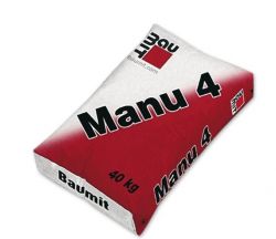 Baumit Manu 4 (Baumit durva vakolat 4mm 40kg) Mész-cement alapvakolat, hagyományosan kézi felhordásra, durván lehúzva külső és belső felhasználásra. Anyagszükséglet: kb. 16 kg/m2/cm Kiadósság: kb. 1,2 m2/zsák, kb. 30 m2/to, 2 cm-es vakolatvastagságnál Csomagolás: 40 kg-os zsák, 35 zsák/raklap = 1400kg