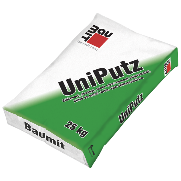 Baumit Uni Vakolat 25 kgUniverzális mész-cement vakolat kézi bedolgozásra, mindenféle alapra külső és belső felhasználásra, alapvakolatként és simítóvakolatként.Anyagszükséglet:  4 mm vastagságnál kb 5kg/m210 mm vastagságnál kb 12,5 kg/m2Keverővíz szükséglet: kb 5,6 l/zsák